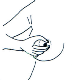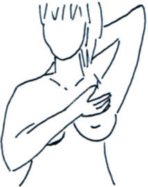 Unieś zgiętą w łokciu lewą rękę, połóż lewą dłoń z tyłu głowy, a prawą na lewej piersi. Badanie najlepiej wykonywać pod prysznicem, gdy skóra jest namydlona. Lekko naciskając trzema środkowymi palcami zataczaj drobne i większe kółeczka, zaczynając badanie od brodawki, a przechodząc na zewnątrz. Staraj się wyczuć, czy nie występuje guzek lub stwardnienie. To samo zrób z prawą piersią. Załóż prawą dłoń za głowę, a lewą zbadaj prawą pierś.